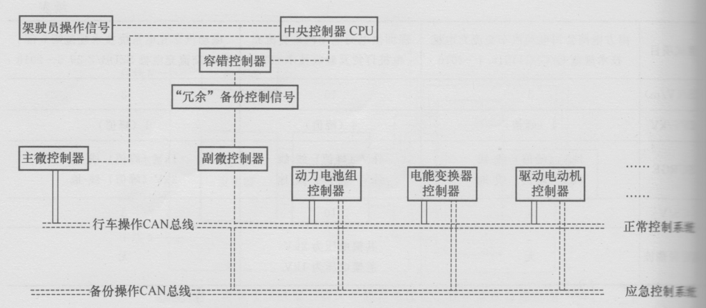 為了防備電動汽車的微控制器或電路因受干擾、老化或損傷而失效,引發(fā)電動汽車運(yùn)行過程中發(fā)生事故,現(xiàn)代電動汽車上采用容錯控制器以實(shí)現(xiàn)容錯功能,容錯控制器一般采用冗余處理策略,即是在電子電器控制系統(tǒng)中,裝置一個主微控制器,并備份一個備用副微控制器,副微控制器具有主微控制器的基本功能,并對主微控制器有檢測的功能。一旦主微控制器發(fā)生故障,副微控制器立即“接管”主微控制器全部功能,保證電動汽車不至于陷入失控狀態(tài)而造成事故或損傷。容錯控制器發(fā)揮出“失效安全”(fail-safety)的作用。副微控制器可以重新啟動主微控制器,檢測其是否能夠恢復(fù)全部功能,還可以檢測出主微控制器是否損壞,以及實(shí)時取代主微控制器進(jìn)入狀態(tài)。保證了電動汽車不會出現(xiàn)“死車”,而能夠維持返回或開到維修廠。采用“冗余”結(jié)構(gòu)的容錯控制器的容錯系統(tǒng)如圖5-39所示。