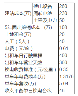 公開資料顯示北汽電池收費套餐折合為0.35元/公里,換電站的運營成本包括建站成本、用電、地租和人工等,我們從投資收益的角度對出租車底盤換電模式進行初步的探討跟分析: